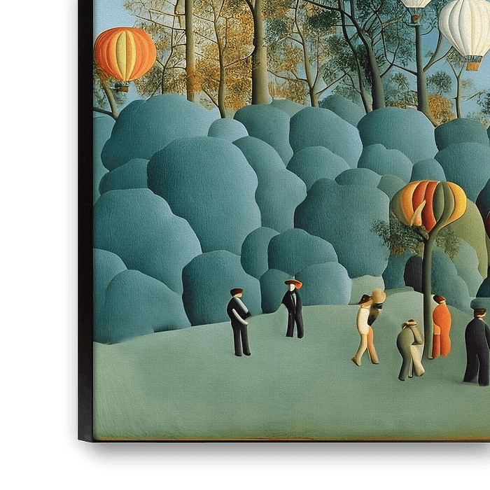 Dit artwork laat een kleurrijk ballonnenfestival zien dat plaatsvindt in een bos vol met mensen. De ballonnen lijken bijna levend, alsof ze zweven en dansen tussen de bomen. De scène is zo gedetailleerd dat het lijkt alsof je elk geluid en geur van het festival kunt ervaren. Het geheel creëert een droomachtige surrealistische sfeer die zowel vreemd als betoverend is.