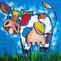 Er is gebruikgemaakt van een opbeurend kleurenpalet, waar elke penseelstreek een uitnodiging is om te genieten van de prachtige tinten die harmonieus samenkomen. De koe, met haar speelse houding en vriendelijke uitstraling, lijkt bijna te stralen te midden van een feest van kleuren.