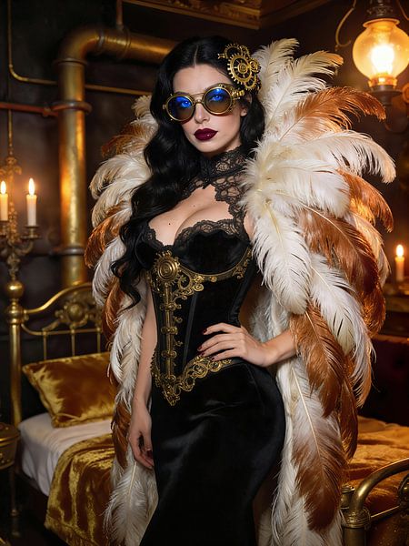 Dit werk toont een figuur die niet poseert, maar zijn aanwezigheid laat gelden. De kamer ziet eruit als een privétoneel: warm licht, messing, stoffen en mechaniek smelten samen tot een sfeer die het midden houdt tussen een boudoir en een machinekamer. De veren omlijsten het lichaam niet als louter versiering, maar als een opzettelijk…