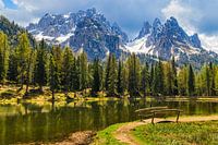 In het water weerspiegelen zich de grillige bergtoppen van de Cadini di Misurina die zich oostelijk van het meer verheffen.