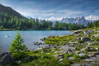 Het meer van Arpy (Lago d'Arpy in het Italiaans) en de berg Grandes Jorasses in het Mont Blanc-massief op de achtergrond. Morgex, Aostadal, Italië