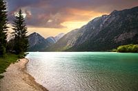 Prachtige avondsfeer aan het meer van Heiterwanger in Tirol.