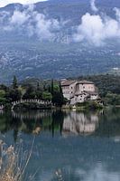 Het meer van Lago di Toblino en Toblino kasteel weerspiegeld in het water met mysterieuze wolken hangend in de bergen