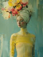 Het meisje en de bloemen. Modern portret van een meisje in geel met bloemen op haar hoofd. Zachte pastelkleuren maken een bijzondere blikvanger van dit werk.