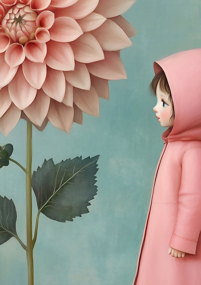 Een meisje in een lichtroze jas en bijpassende laarzen staat gracieus naast een delicate roze dahlia. De compositie is sereen en sfeervol en roept een gevoel van verwondering en stille introspectie op.