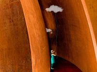 "Het meisje en de wolk" toont een verstild moment in een vervreemdend landschap. Een jong meisje, klein en kwetsbaar, staat aan het begin van een monumentaal doolhof van roestige stalen platen, herkenbaar als het werk van Richard Serra. De platen rijzen hoog boven haar uit, hun roestige huid warmt op in het diffuse licht, en hun ronde…