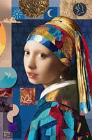 Dit werk is een moderne en gedurfde herinterpretatie van Vermeers iconische "Meisje met de Parel". Door gebruik te maken van een innovatieve mixed media aanpak, waarin digitale collage, texturen en levendige kleuren samensmelten, wordt een nieuwe dimensie toegevoegd aan het klassieke portret. Het originele beeld is behouden in haar subtiele, mysterieuze blik, terwijl de omringende lagen en patronen het werk een eigentijdse flair geven. Elke laag, vorm en kleur is zorgvuldig geplaatst om zowel eer te betonen aan het verleden als een sprong te maken naar het heden.