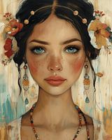 Het meisje met de blauwe ogen, illustratie. Bijzonder portret in aardetinten van een meisje met blauwe ogen en bloemen in het haar. Een bijzondere blikvanger!