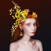 Krans van bloemen gedragen door deze fraaie roodharige vrouw