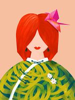 Dit is een portret van een meisje. Haar rode lokken vallen over haar gezicht. Ze heeft een knalroze origami kraanvogel in haar haren, dat een mooi contrast geeft met haar rode haren. Ze draagt een chinees jasje in blauw met groene tinten en twee madeliefjes erop gespeld. In haar oren draagt ze hangers met het oneindig symbool. Ondanks…