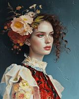 Het meisje met de krullen. Modern portret van een jonge vrouw met bloemen in klassieke kleding. De kleuren zijn zorgvuldig met elkaar gecombineerd. Dit is een bijzondere blikvanger.