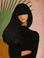 Ze heeft geen haast om gezien te worden. Dit portret straalt die nonchalante coolness uit die je niet kunt faken. Met haar donkere lokken, zachte perzikkleurige achtergrond en strakke compositie is dit kunstwerk minimalistisch, stijlvol en een tikkie mysterieus.