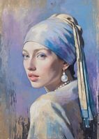 Dit abstracte portret herbeeldt het iconische Meisje met de parel door middel van expressieve schildertexturen. De bekende figuur komt tevoorschijn in verzachte vormen, haar blik mysterieus maar tijdloos, terwijl penseelstreken randen oplossen in vloeiende lagen van abstractie. De parel zelf wordt een lichtgevend brandpunt, glinsterend in het omringende ritme van kleur en beweging. Het werk vangt de delicate balans van intimiteit en raadselachtigheid en nodigt kijkers uit om een meesterwerk te herontdekken in een moderne, emotionele taal.