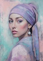 Dit abstracte portret herbeeldt het iconische Meisje met de parel door middel van expressieve schildertexturen. De bekende figuur komt tevoorschijn in verzachte vormen, haar blik mysterieus maar tijdloos, terwijl penseelstreken randen oplossen in vloeiende lagen van abstractie. De parel zelf wordt een lichtgevend brandpunt, glinsterend in het omringende ritme van kleur en beweging. Het werk vangt de delicate balans van intimiteit en raadselachtigheid en nodigt kijkers uit om een meesterwerk te herontdekken in een moderne, emotionele taal.