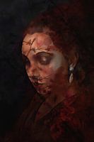 Het meisje met de parel ontmoet de bloemen van de Heem. Een abstracte vertaling in donkere kleuren met veel detail.