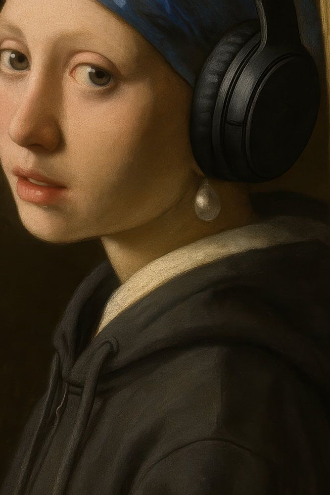 Op een tijdloos moment straalt het meisje met de parelwitte oorbel een fascinerende mix van traditie en moderniteit uit. Het contrast tussen de elegante hoofddoek en de casual hoodie creëert een aantrekkelijke dynamiek, terwijl de koptelefoon nieuwsgierigheid en ontspanning symboliseert. Dit kunstwerk verandert elke woonkamer in een plek van inspiratie en verwondering.