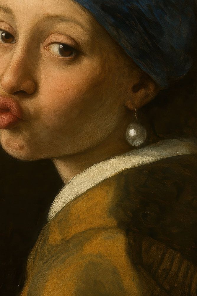 Het portret van een meisje met een glinsterende parel en een levendige hoofddoek straalt mysterie en tijdloze schoonheid uit. De delicate gezichtsuitdrukking en compositorische diepte pakken de kijker meteen. Perfect voor de woonkamer, creëert het een elegant middelpunt en moedigt het aan tot nadenken en dromen.