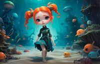 Het lieve kleine zeemeisje, zij leeft op de bodem van de zee, tussen het prachtige kleurige koraal en de kleurige vissen. Zij leeft als een zeemeermin, de zeebodem is haar thuis. Zij heeft fel oranje haar dat meedeint met de golven. Het beeld is met behulp van ai gegenereerd.