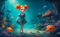 Het lieve kleine watermeisje, zij leeft op de bodem van de zee, tussen het prachtige kleurige koraal en de kleurige vissen. Zij leeft als een zeemeermin, de zeebodem is haar thuis. Het zeemeisje heeft fel oranje haar en zij draagt een kort jurkje dat meedeint met de golven. Het beeld is met behulp van ai gegenereerd.