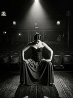 Dit beeld legt misschien wel het stilste moment van de hele avond vast. De zaal is leeg, de rijen stoelen verdwijnen in het halfduister en toch hangt er een gevoel van verwachting in de lucht. Een enkele lichtkegel schijnt van boven naar beneden en isoleert de vrouw op het podium - niet als ster, maar als persoon.