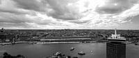Vanaf een hoog punt van een in aanbouw zijnde gebouw aan de noordzijde van het IJ toont dit werk een fantastisch panoramisch zicht op een groot gedeelte van de stad Amsterdam. Rechts op de voorgrond is de ADAM toren te zien. De toren heeft op het dak een schommel die buiten het dak schommelt! Menig toerist heeft er al doodsangsten uitgestaan. Over het water van het IJ is het Centraal station te zien, met zijn overkapping waar met grote letters AMSTERDAM op staat. Op het water varen de ponten van het openbare vervoer. Boven de stad hangt een machtige wolkenpartij. Dit werk is zowel in kleur als in zwart-wit te bestellen.