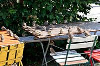 Toen mijn dochter en ik pizza gingen eten in een kleine pizzeria in Berlijn, Duitsland, hadden we zoveel plezier met al die mussen. Het was duidelijk dat ze wachtten tot de klanten hun pizza op hadden, waarna ze naar binnen vlogen om te vechten om de overgebleven stukken.