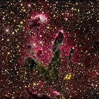 Geretoucheerde afbeelding. Beeldelementen geleverd door NASA. Kunstwerk Het nabij-infrarood licht kan veel van het gas en stof doordringen, waardoor sterren achter de nevel zichtbaar worden en ook sterren die verborgen zitten in de pilaren.
