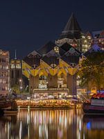 Het nachtelijke zicht op de Kubuswoningen, Laurenskerk en Het Potlood in Rotterdam. Dit werk is onderdeel van de fotocollectie van MS Fotografie. Klik rechts op "Alle werken" om meer werken uit de collectie te zien.