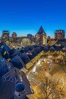 Het nachtelijke zicht op de Kubuswoningen en de Markthal in Rotterdam. Dit werk is onderdeel van de fotocollectie van MS Fotografie. Klik rechts op "Alle werken" om meer werken uit de collectie te zien.