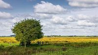 Op de foto zie je het weidse landschap met een loofboom en een bankje op de voorgrond waar je kunt zitten en uitkijken over dit prachtig natuurgebied.