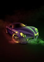 Een levendige Alfa Romeo sportwagen, badend in surrealistisch neon groen en rood licht, lijkt op snelheid door een rokerige duisternis te rijden. Deze gestileerde illustratie vangt pure, elektrische energie.