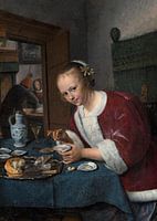 Jan Steens schilderijen bezitten vaak een vleugje erotiek. Hier kijkt een jonge vrouw ons schalks aan, terwijl ze een oester klaarmaakt. Oesters staan bekend als een lustopwekkend middel. Dit meisje lijkt dus meer te willen dan lekker eten alleen.
