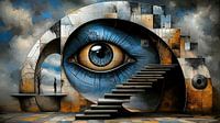 De foto toont een monumentaal oog ingebed in een massieve, architecturale structuur die zowel organisch als geometrisch lijkt. De koele, blauwe iris van het oog steekt af tegen het verder aardse kleurenpalet, dat roestige en betonachtige oppervlakken op de voorgrond plaatst. Het oog domineert het landschap alsof het alles overziet - een stille, alwetende waarnemer te midden van een surreële wereld. Trappen spiraalsgewijs omhoog en verdwijnen in de schaduwen, terwijl afbrokkelende muren en raamopeningen naar het niets leiden, waardoor het beeld een sfeer van mysterie en onvolledigheid krijgt.