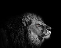De afbeelding toont een close-up van de linkerkant van het gezicht van een leeuw. De manen van de leeuw zijn prominent en goed zichtbaar, met een opvallende textuur die prachtig wordt benadrukt door het gebruik van zwart-wit in de foto. De linkeroor van de leeuw is duidelijk in beeld, terwijl de rechterkant van de afbeelding vervaagd…