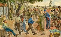 Impressionistische weergave van een groep dansende en feestende mensen op het Vlaamse platteland tijdens het oogstfeest. (medio augustus)