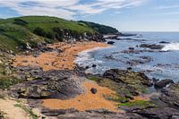 Soms kom je ineens prachtige plekken tegen zonder dat je het verwacht. Dit strand is zo'n plek. Het zand is oranje, de lucht blauw en de omgeving groen. Super mooi!
