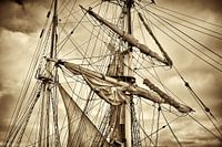 Sepia getoond beeld van een oud zeilschip met verweerde zeilen