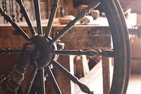Abstract stilleven van een oud houten spinnewiel. Een close-up van een traditioneel spinnewiel verlicht door zacht natuurlijk licht in warme bruintinten.