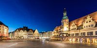 Panorama Oude Stadhuis en historische gebouwen op de markt in het centrum van Leipzig bij nacht, Saksen, Duitsland.