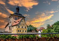 Het oude stadhuis van Bamberg met de rivier de Regnitz bij zonsondergang