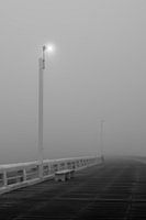 De oude houten pier in de Koningin der Badsteden ,geen vroege wandelaars , geen zomerse temperaturen , enkele de leegte van een koude mistige ochtend onder het mistroostige licht van een lantaarn .