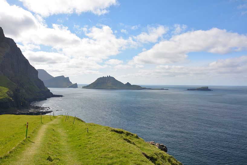 Volg het kronkelende, met gras begroeide pad langs de indrukwekkende kustlijn van Vágar, met uitzicht op het iconische, grillige silhouet van Tindhólmur. Deze onbewerkte foto legt de Faeröer vast op een moment van schitterende helderheid, waar levendig groene landtongen het diepe blauw van de Noord-Atlantische Oceaan ontmoeten. Pluizige…