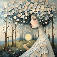 In “Het Pad naar Dromen” wordt de kijker uitgenodigd om de schoonheid van de natuur te verkennen. De vrouw, met een kroon van bloemen, is omgeven door een zee van delicate bloesems en een smalle weg die leidt naar de horizon. De zachte, dromerige kleuren en de speelse compositie creëren een ethereal sfeer die uitnodigt tot reflectie. Dit kunstwerk, een prachtig voorbeeld van hedendaagse surrealistische kunst, symboliseert de reis naar zelfontdekking en de vreugde van het leven. Breng dit unieke schilderij in huis en laat het je verbeelding prikkelen.