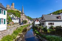 Schilderachtig uitzicht op het historische centrum van het dorp Monreal in de Eifel met de Elzbach en de Philippsburg