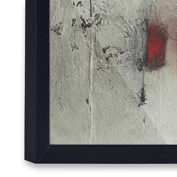 is een expressief abstract kunstwerk dat diepte, spanning en gevoeligheid combineert. Te midden van een rustig, bijna mistig vlak ontvouwt zich een warme, roodbruine verdichting – als een innerlijk vuur dat onder het oppervlak gloeit.
