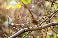 Een kleine vogel - een roodborstje ( Erithacus rubecula ) zittend op een tak in de natuur