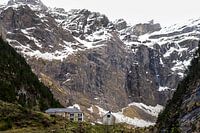 Cirkelvormige rotsformatie met watervallen in de Franse Pyreneeën op de grens met Spanje, bekend als Cirque de Gavarnie. Vanuit het nabijgelegen dorp Gavarnie voert een wandeling van vier kilometer naar de imposante bergtoppen van 3000 meter hoog, die de natuurlijke grens vormen tussen Frankrijk en Spanje. Een eenzaam hotel met de naam cirque en cascade de Gavarnie ligt op de voorgrond. Deze foto is gemaakt in het voorjaar van 2025.