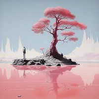 Een surrealistische afbeelding van een roze boom op een eiland in een roze zee met een persoon die op het eiland staat. De afbeelding roept een gevoel van isolatie en mysterie op.