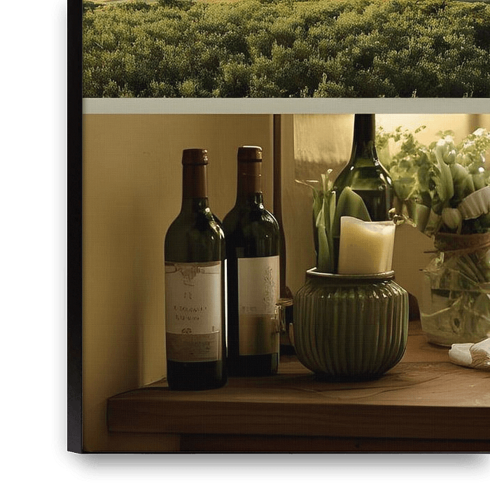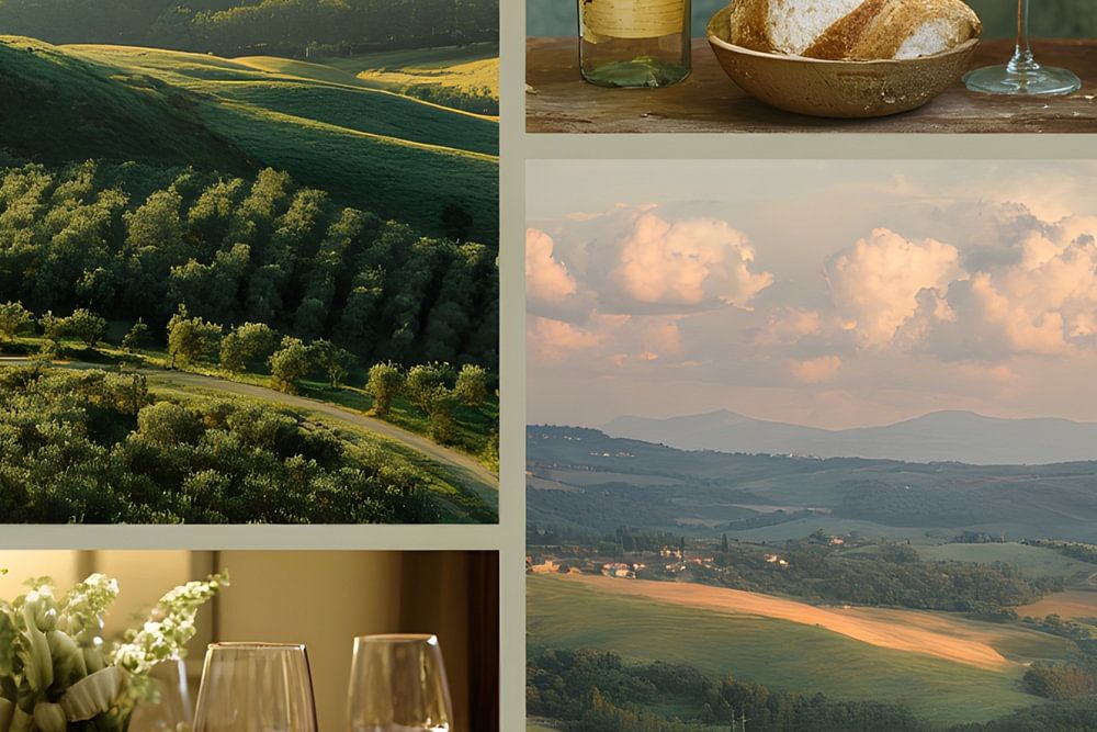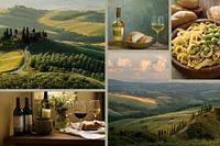 Een harmonieuze collage van beelden van glooiende Toscaanse heuvels, cipressenlanen en warm avondlicht, gecombineerd met stillevens van wijn, brood en verse pasta. Natuur en culinaire hoogstandjes smelten samen om de Italiaanse manier van leven te symboliseren.