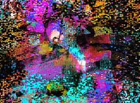 Een digitaal abstract met de suggestie van vormen die vloeiend bewegen achter een cellulair, mozaïek effect. Ik heb het Piecing Together The Past genoemd.